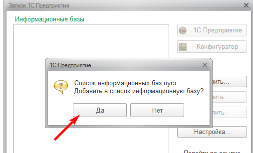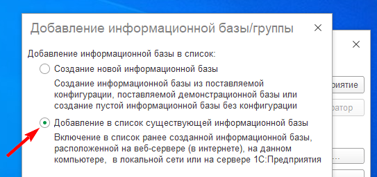 В окне со списком баз нажмите кнопку Добавить..., затем выберите пункт «Добавление в список существующей информационной базы» и нажмите Далее. -