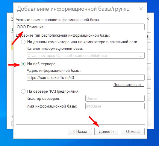 - Адрес информационной базы — вставьте ссылку на базу из письма с доступом к облаку.